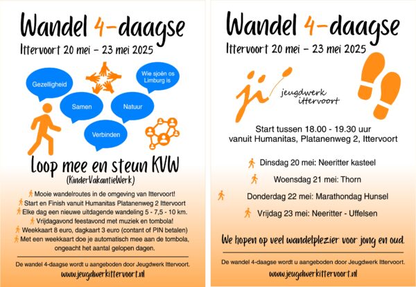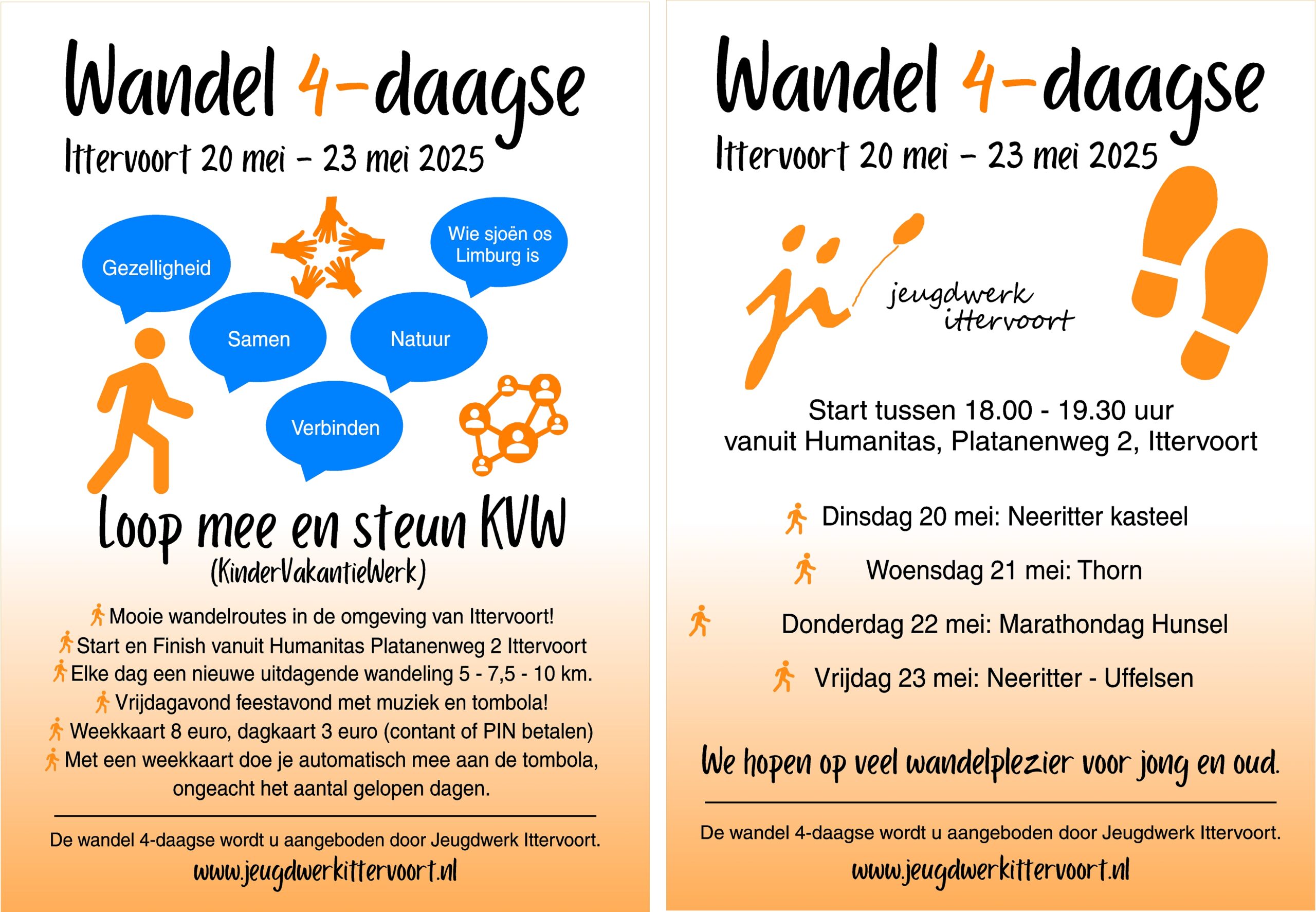 We organiseren jaarlijks de W4D (Wandelvierdaagse) voor jong en oud uit Ittervoort en wijde omgeving. Naast het sociaal verbindende karakter en de zichtbaarheid van onze stichting, zijn de opbrengsten van de W4D ook bedoeld om de kosten van de KVW week voor deelnemende gezinnen te dempen.
